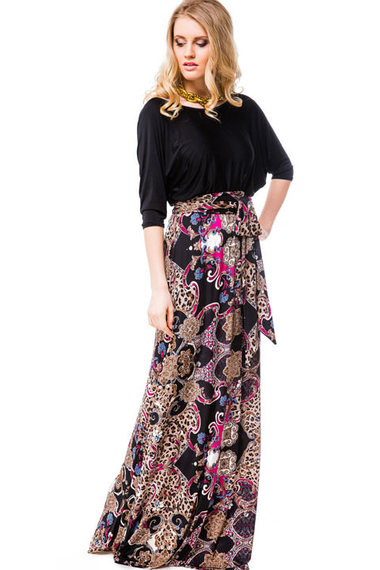 Длинное загадочное платье, выполненное из износоустойчивой микрофибры. Верх изделия изготовлен в черном цвете с рукавами фасона "летучая мышь", юбка с абстрактным принтом дополнена поясом.