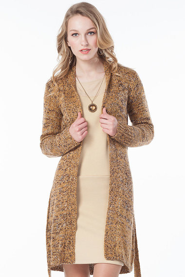 Уютный и теплый кардиган из пряжи меланж в песочных оттенках. Модель удлиненная, без застежек, с поясом в тон кардигана.