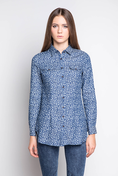 ОписаниеХлопковая рубашка с длинным рукавом. Выполнена из синей ткани с мелким цветочным узором. На груди накладные карманы. Длинный рукав при желании можно трансформировать в 3/4, для этого на рукавах имеются специальные пуговицы и прихваты.